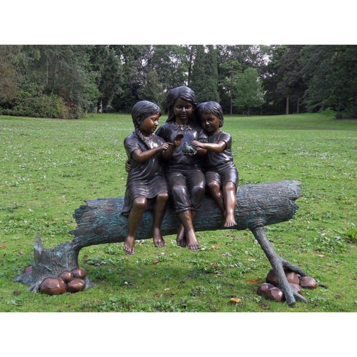La Estatua de Bronce de Tres Niñas en un Baúl (97 x 43 x 120 cm [Alto x Ancho x Profundidad]) se distingue por su vibrante pátina, obtenida mediante un cuidadoso proceso químico que transforma el color amarillo o cobrizo natural del bronce en ricos tonos de marrón oscuro, verde o negro. Esto le da a cada estatua una apariencia única, convirtiéndola en el centro de atención de cualquier espacio. Ya sea en interiores o exteriores, sigue siendo una obra de arte impactante.
