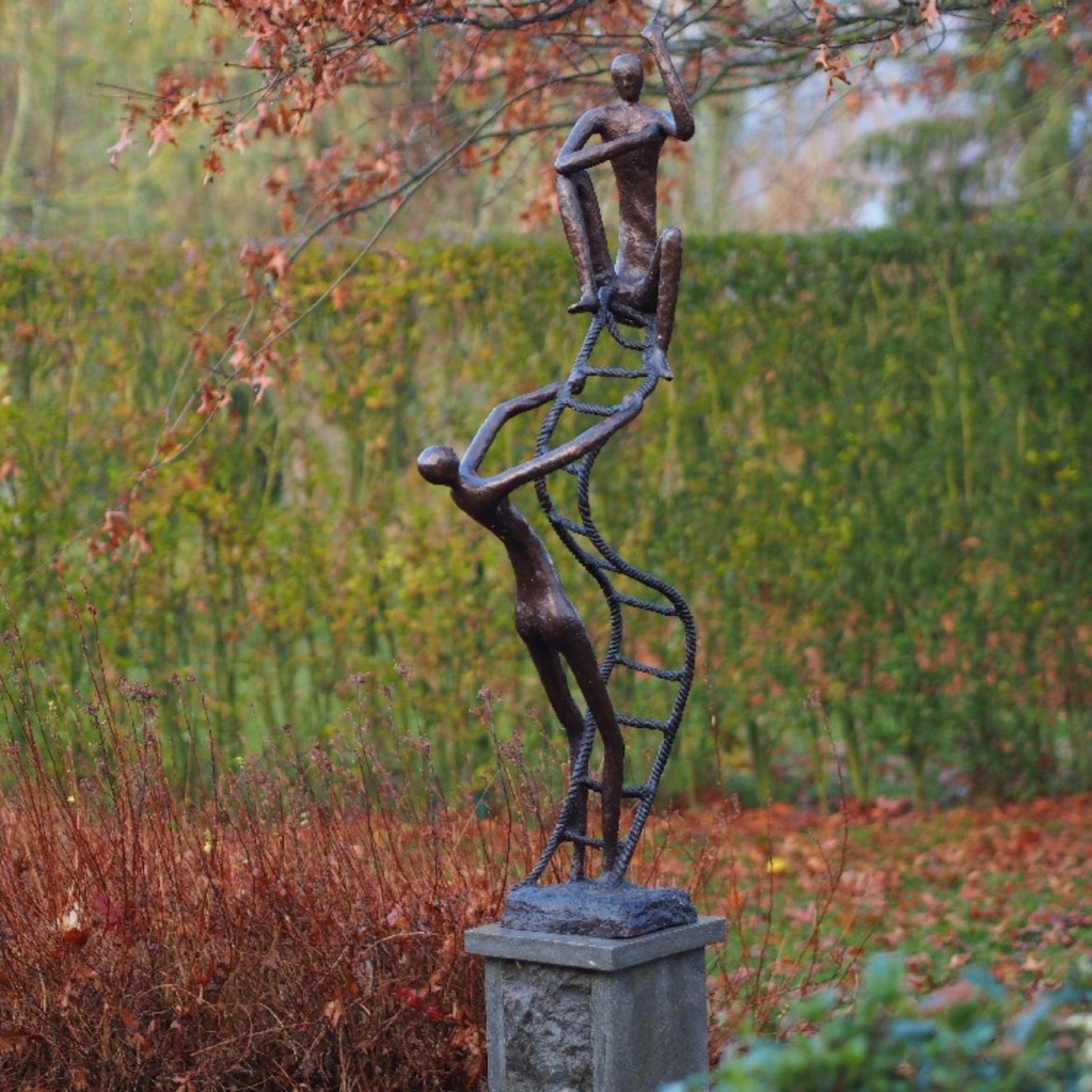 La Estatua de Bronce 2 en una Escalera (118 x 20 x 50 cm [Alto x Ancho x Profundidad]) se distingue por su vibrante pátina, lograda mediante un cuidadoso proceso químico que transforma el color amarillo o cobrizo natural del bronce en ricos tonos de marrón oscuro, verde o negro. Esto le da a cada estatua una apariencia única, convirtiéndola en el centro de atención de cualquier espacio. Ya sea en interiores o exteriores, sigue siendo una obra de arte impactante.