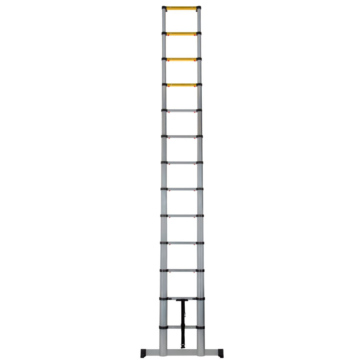 La escalera telescópica Extendo combina a la perfección flexibilidad, seguridad y practicidad. Gracias a su ingenioso diseño, cada peldaño se extiende y retrae individualmente, lo que permite ajustar fácilmente la altura a la tarea. Con peldaños extra anchos y una distancia entre peldaños de 29 cm, podrá trabajar con estabilidad y comodidad, mientras que los peldaños amarillos indican claramente dónde no puede permanecer de pie. Completamente retraída, la escalera es compacta y fácil de guardar y transportar, ideal tanto para uso doméstico como profesional.