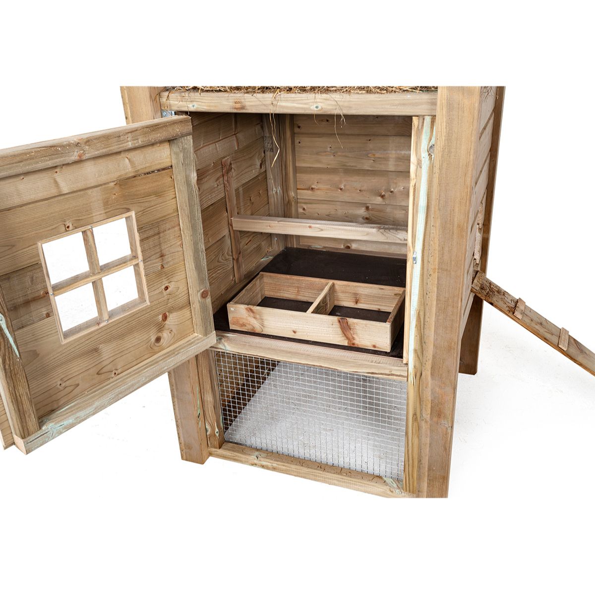 El Pajar para Gallinas Pleun está ligeramente elevado, lo que no solo evita la humedad ascendente, sino que también proporciona protección contra el frío. Este diseño elevado garantiza que el clima interior del gallinero se mantenga siempre agradable, incluso en días fríos y húmedos. Sus gallinas se sentirán seguras y cómodas, independientemente del clima.