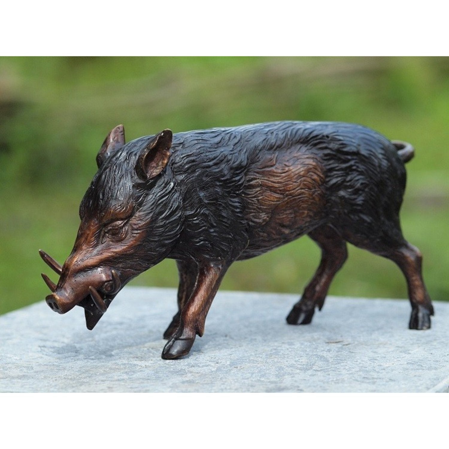 La Estatua de Bronce de Jabalí Pequeño (17 x 13 x 36 cm [Alto x Ancho x Profundidad]) se distingue por su vibrante pátina, obtenida mediante un cuidadoso proceso químico que transforma el color amarillo o cobrizo natural del bronce en ricos tonos de marrón oscuro, verde o negro. Esto le da a cada estatua una apariencia única, convirtiéndola en el centro de atención de cualquier espacio. Ya sea en interiores o exteriores, sigue siendo una obra de arte impactante.