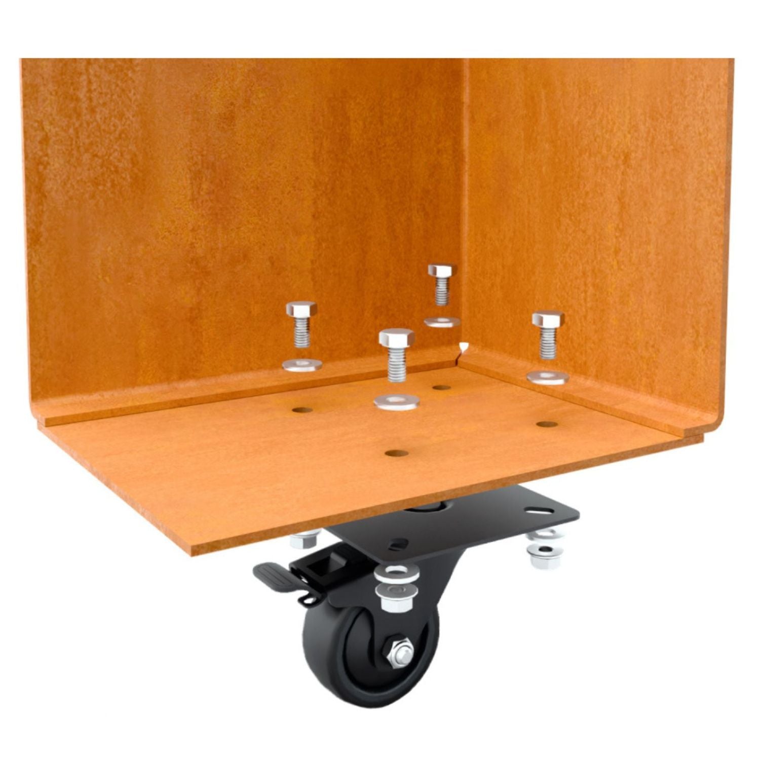 Vierkante cortenstalen plantenbak met wielen 50x50x100 cm