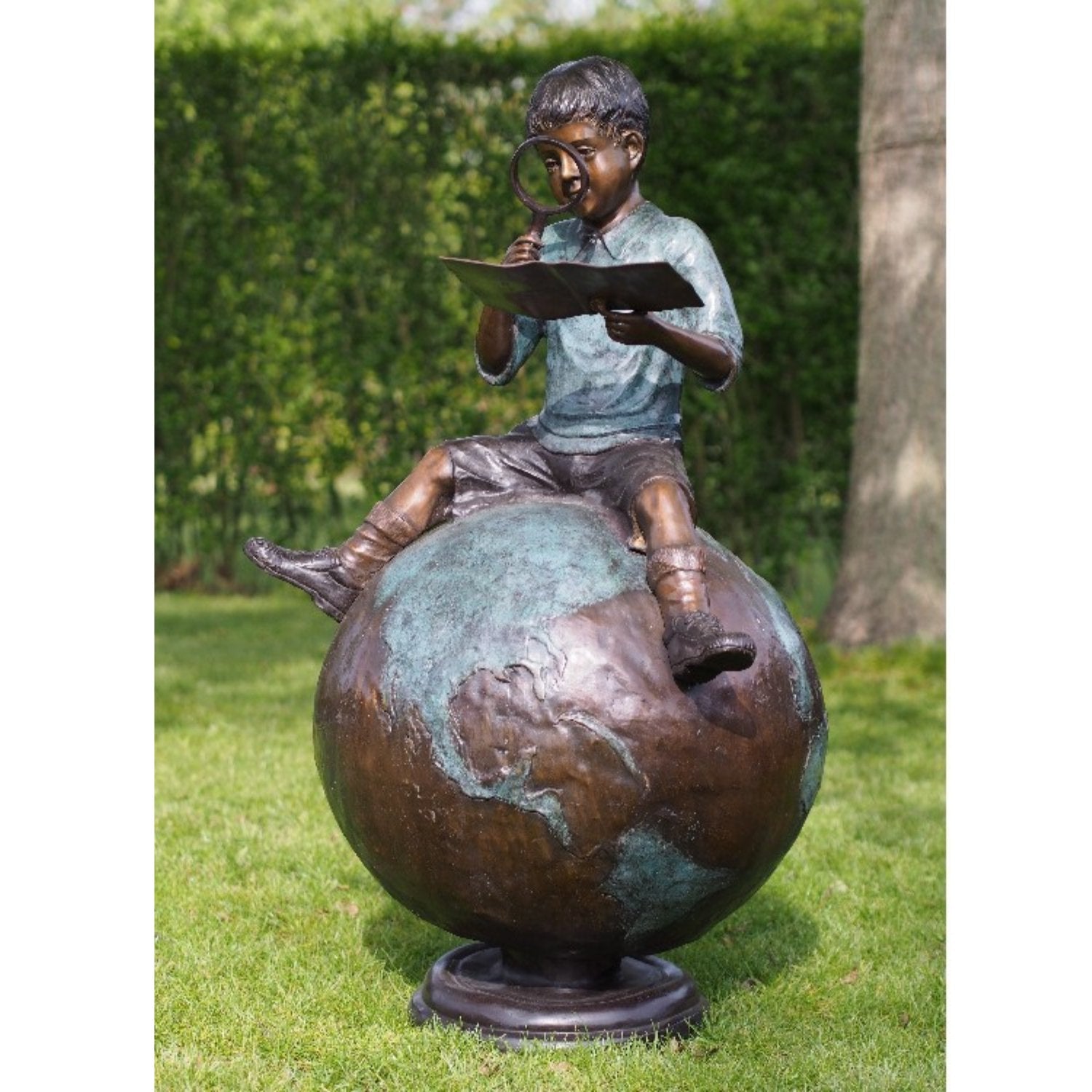 La Estatua de Bronce de un Niño Sentado en un Globo Terráqueo (126 x 72 x 60 cm [Alto x Ancho x Profundidad]) se distingue por su vibrante pátina, obtenida mediante un cuidadoso proceso químico que transforma el color amarillo o cobrizo natural del bronce en ricos tonos de marrón oscuro, verde o negro. Esto le da a cada estatua una apariencia única, convirtiéndola en el centro de atención de cualquier espacio. Ya sea en interiores o exteriores, sigue siendo una obra de arte impactante.