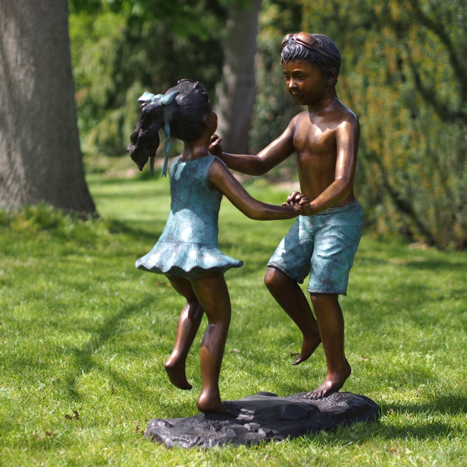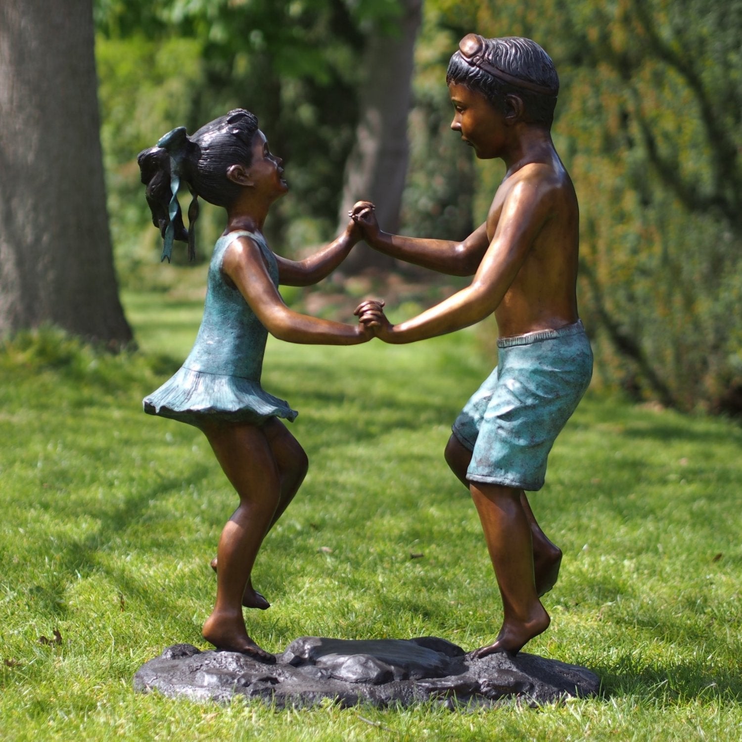 La Estatua de Bronce de Niño y Niña Bailando (92 x 35 x 60 cm (Alto x Ancho x Profundidad)) se distingue por su vibrante pátina, obtenida mediante un cuidadoso proceso químico que transforma el color amarillo o cobrizo natural del bronce en ricos tonos de marrón oscuro, verde o negro. Esto le da a cada estatua una apariencia única, convirtiéndola en el centro de atención de cualquier espacio. Ya sea en interiores o exteriores, sigue siendo una obra de arte impactante.