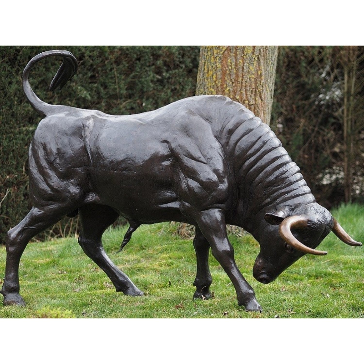 La Estatua de Toro de Bronce (178 x 80 x 235 cm (Alto x Ancho x Profundidad)) se distingue por su vibrante pátina, lograda mediante un cuidadoso proceso químico que transforma el color amarillo o cobrizo natural del bronce en ricos tonos de marrón oscuro, verde o negro. Esto le da a cada estatua una apariencia única, convirtiéndola en el centro de atención de cualquier espacio. Ya sea en interiores o exteriores, sigue siendo una obra de arte impactante.